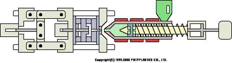 合模裝置是開(kāi)閉模具以執(zhí)行脫模作業(yè),而且也有如圖所示的肘桿方式,以及利用油壓缸直接開(kāi)閉模具的直壓方式。注射裝置是將樹(shù)脂予以加熱融化後再射入模具內(nèi)此時(shí),要旋轉(zhuǎn)螺桿,并如圖所示讓投入到料斗的樹(shù)脂停留在螺桿前端,經(jīng)過(guò)相當(dāng)于所需樹(shù)脂量的行程儲(chǔ)藏後再進(jìn)行射出。當(dāng)樹(shù)脂在模具內(nèi)流動(dòng)時(shí),則控制螺桿的移動(dòng)速度并在填充樹(shù)脂後用壓力(保壓力)進(jìn)行控制。當(dāng)達(dá)到一定的螺桿位置或一定射出壓力時(shí)則從速度控制切換成壓力控制。