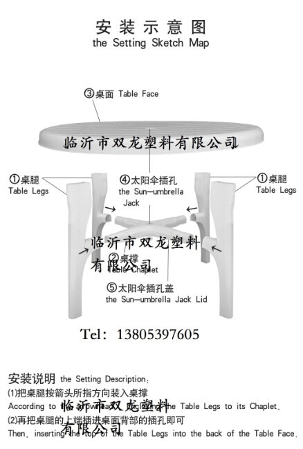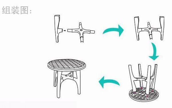 關(guān)于拼裝通過下面的示意圖可以看出基本的步驟。實(shí)際操作中首先是桌腿與桌撐的組合,通過預(yù)留的卡槽,首先手持桌撐將桌腿卡入,一次重復(fù)四次將四條桌腿安裝完畢。然后將桌面反向放置于平整地面,將組合好的桌腿與桌撐,對(duì)準(zhǔn)卡槽,推入四條桌腿,這樣一個(gè)完整的塑料桌子就組裝好了。拆卸過程同樣簡單,指示把上述流程反向操作即可。